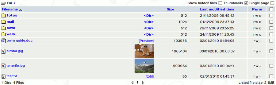 The Webdisk can make thumbnails of graphics files (JPEG, GIF, etc.) and display them. First, you need to activate the Thumbnails
